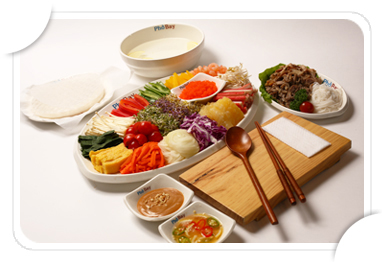 Fresh wrap with vegetable & meat28,000원 신선한 야채, 과일, 고기 등을 취향에 맞게 선택하여 함지쌈에 싸서 땅콩소스 혹은 피쉬소스에 찍어 먹는 웰빙 스타일 베트남 전통요리 고기추가 6,000 야채추가(4가지) 4,000